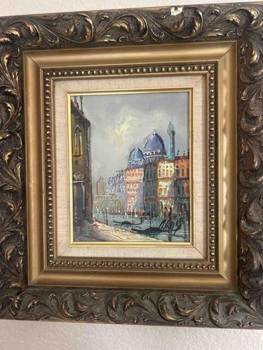 This is a small-format oil painting on board, depicting a classic Venetian cityscape featuring the Grand Canal, gondolas, and the Santa Maria della Salute in the background. The artwork is executed in an Impressionist style with visible, expressive brushwork and a muted palette of grays, blues, and warm ochres. The painting is housed in a very ornate, heavy-set Rococo-style composite frame. The frame features a deep profile with elaborate acanthus leaf scrollwork and a gilded finish that shows signs of artificial patination or darkening in the recessed areas. A linen liner with a gold-leaf inner fillet separates the artwork from the main frame, a common mid-to-late 20th-century framing technique. The condition of the artwork appears stable, though the frame shows a significant chip or area of loss on the top center edge, revealing the white gesso or plaster beneath the gilding. There is a visible artist signature in the lower right corner, though it is stylized and difficult to decipher without closer inspection. Based on the framing and technique, this likely dates from the 1960s to 1980s, possibly intended for the souvenir or decor market. The quality of the brushwork is confident, particularly in the rendering of the water's reflections.