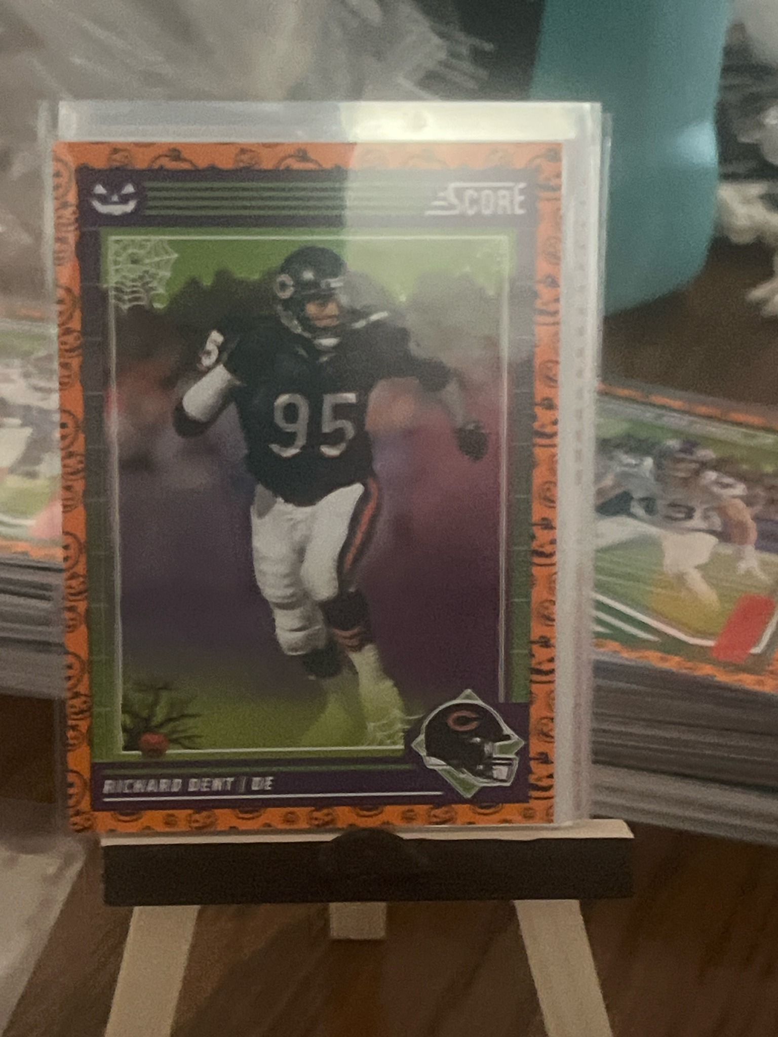 This is a modern 2023 Panini Score football card featuring Hall of Fame Defensive End Richard Dent of the Chicago Bears. This specific card is the 'Halloween Treat' parallel, a seasonal insert recognizable by its vibrant orange border filled with repeating pumpkin/jack-o'-lantern icons and a purple inner frame. The design includes thematic elements such as a white spiderweb in the top left corner, a jack-o'-lantern face in the upper left, and a spooky green-to-black gradient background behind the player's action photo. Dent is shown in his classic home navy jersey with the number 95. The Score brand logo is visible in the top right corner, and the Chicago Bears helmet logo is located in the bottom right corner above the player's name and position text 'Richard Dent | DE'. The card appears to be in Excellent to Near Mint condition, protected within a clear soft sleeve. There are no immediate visible signs of corner dings, surface scratching, or edge whitening in the photo, though the centering appears slightly biased towards the right. This modern trading card uses high-quality glossy cardstock and is part of a standard 2.5 by 3.5 inch production run intended for seasonal retail distribution.