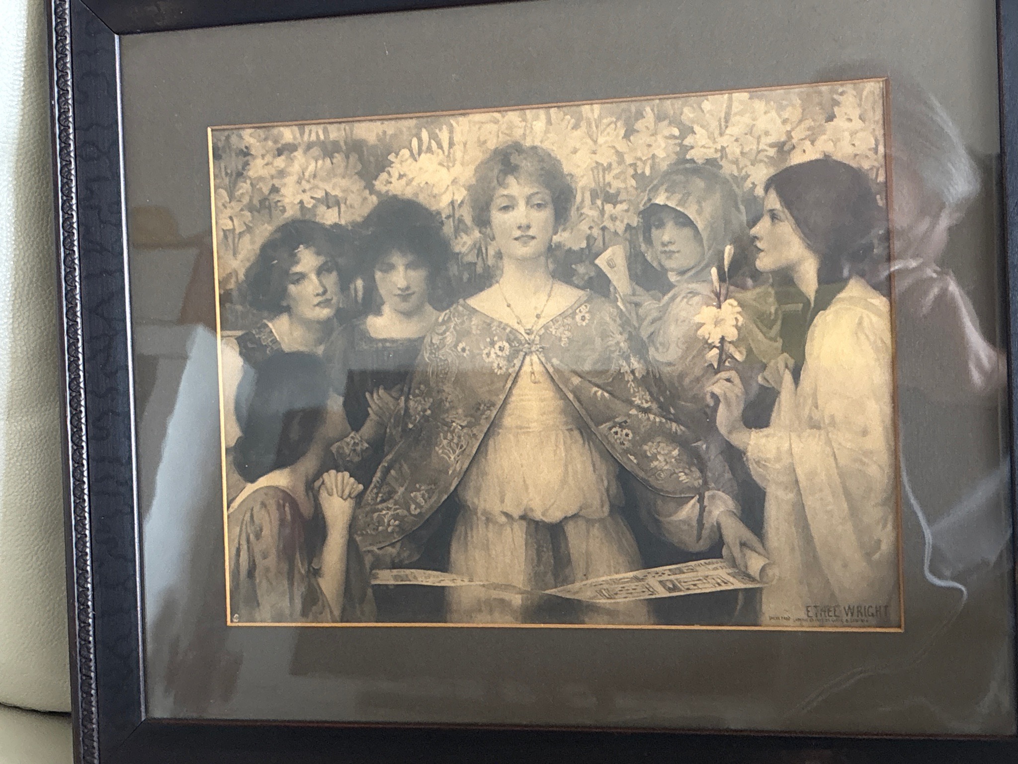 This is a monochrome sepia-toned print of the painting "Songs of Greeting" by the British artist Ethel Wright (1866–1939). The imagery features a group of several young women in Aesthetic or Pre-Raphaelite style attire, positioned against a dense backdrop of tall white lilies. The central figure wears a decorative floral cloak and a pendant necklace, holding a scroll of sheet music with other women. The composition is characteristic of Wright's late 19th-century work, emphasizing feminine beauty and romanticism. The print is housed in a dark, rectangular wooden frame with a detailed beaded or rope-twist inner border. It is professionally matted with a dark grey or charcoal mat board that features a thin gold-toned fillet or bevel. The artist's name, 'ETHEL WRIGHT', is clearly visible in block lettering in the lower right corner, along with smaller publication text indicating it may be a copyright-protected lithographic or photogravure reproduction from the late Victorian or Edwardian era. The condition appears stable, though there is some light reflection on the glass; the paper shows a warm patina consistent with age. There are no obvious tears or foxing visible through the glazing, and the framing demonstrates high-quality preservation techniques.