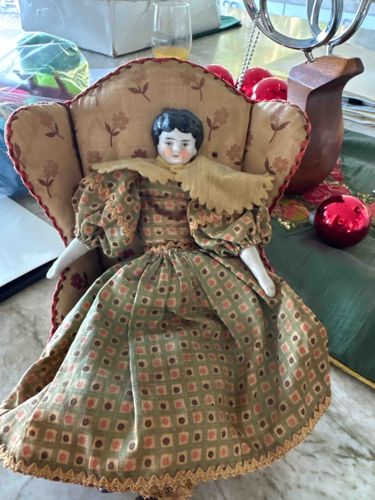 This item is a vintage china head doll, estimated to be from the mid-to-late 19th century (circa 1860-1890). The doll features a glazed porcelain head, known as 'china', with a molded black hairstyle typical of the Civil War or Victorian era. The face is delicately painted with blue eyes, rosy cheeks, and a small red mouth. She possesses a cloth body with porcelain lower arms and hands, displayed sitting in an appropriately scaled, padded wingback chair upholstered in a tan floral fabric. Her outfit consists of a green, brown, and tan patterned dress with puffed 'leg-o-mutton' sleeves, a large scalloped yellow collar, and a yellow lace trim along the hemline. The overall construction suggests hand-made quality common for domestic play during its period. Regarding condition, the porcelain surfaces appear mostly intact, though there is visible age-related wear and fading to the fabrics. The doll's hair shows slight paint loss or rubbing, and the textiles exhibit potential fraying and dust accumulation consistent with long-term storage or display. The chair backing shows some minor spotting. There are no immediate maker's marks visible on the exposed porcelain, which is common for these mass-produced yet artisanal German-style export dolls.
