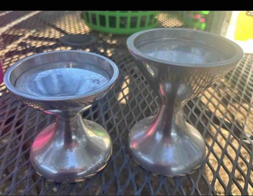 This is a pair of pedestal-style pillar candle holders, likely manufactured by Nambé. Both pieces are crafted from a signature sand-cast aluminum alloy, known for its brilliant, silver-like luster and exceptional thermal properties. The design features a modern, sculptural aesthetic with an hourglass silhouette, tapering at a central waist before flaring into a weighted, circular base. One holder is shorter than the other, intended for use as a graduated set. The top of each piece features a wide, shallow, recessed well specifically designed to hold thick pillar candles. The surface finish is characteristic of hand-polished metal, exhibiting a smooth, reflective sheen across the curves. Regarding condition, the items show visible surface scratches, minor pitting, and dulling of the finish consistent with regular use and age. There are some dark scuff marks or wax residues visible in the candle wells. There are no significant dents or structural deformations visible. Based on the mid-century modern influence and the specific metal alloy appearance, these likely date from the late 20th century to early 2000s. These pieces represent high-quality functional art, valued for both their durability and minimalist elegance.