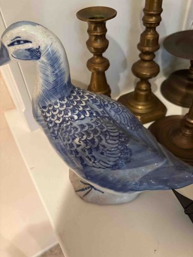 Chinoiserie Blue and White Ceramic Duck Figurine