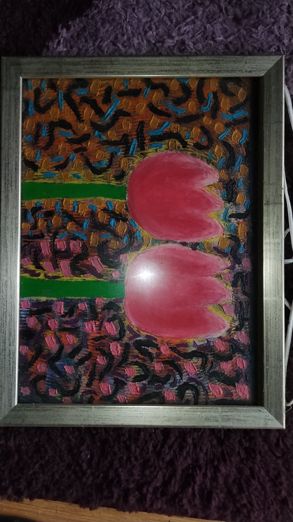 This original work of art is an abstract or post-impressionist floral composition, likely executed in oil or heavy acrylic on canvas or board. The piece features two stylized, vibrant pink flower heads (resembling tulips or lotuses) set against a highly textured, kaleidoscopic background. The background is composed of rhythmic, short impasto brushstrokes in a diverse palette of gold, deep blue, black, and coral. Two horizontal green bands intersect the mid-ground, providing a structural contrast to the chaotic patterning. The technique exhibits significant tactile quality, with visible paint layering that provides depth and movement throughout the frame. The artwork is housed in a contemporary silver-finished wooden or composite mitered frame with a subtle metallic patina and distressed texture. While no signature is immediately visible on the face of the work, the style suggests a late 20th-century or contemporary origin, influenced by neo-expressionist or folk-art traditions. The condition appears stable, though there is a prominent circular glare from external lighting on the lower pink flower during photography. The frame shows minor signs of handling but remains structurally sound.
