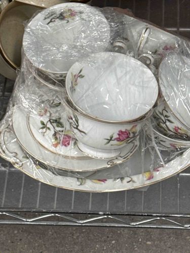 This is a vintage multi-piece tea service set crafted from fine white porcelain or bone china, featuring a classic 'Moss Rose' or similar floral botanical motif. The set consists of at least four pedestal teacups, matching saucers, and two large oval serving platters with scalloped, gilded edges and integrated handles. Each piece is decorated with delicate pink rose blooms, yellow buds, and sage green foliage, characteristic of Mid-Century traditional dinnerware styles common between 1950 and 1970. The construction displays high-quality translucent china with gold-leaf gilding along the rims and footed bases. While currently wrapped in protective plastic film, the visible surfaces appear to be in good vintage condition with no immediate chips or cracks visible, although some light rubbing to the gilt edges is common for its age. The handles on the platters feature ornate scrolling, and the teacups have a slightly flared lip. This set likely originates from a Japanese or European manufacturer (such as Royal Adderley or Sone) known for producing export-quality floral porcelain during the mid-20th century. The craftsmanship is refined, indicated by the thinness of the porcelain and the detail in the transfer-ware floral applications.