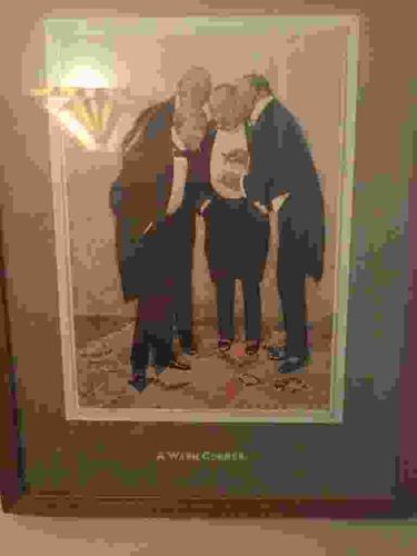 This is a vintage framed color print titled 'A Warm Corner,' which depicts a humorous genre scene typical of the late 19th or early 20th century. The artwork shows four overweight gentlemen in formal tailcoats and waistcoats standing closely together in a semi-circle, seemingly gathered around a heat source or engaged in private conversation. The physical characteristics suggest a chromolithograph or high-quality lithographic process, evident in the soft color gradations and varied palette featuring dark navy blues, blacks, earthy browns, and warm cream flesh tones. The print is set within a wide, dark wooden frame with a decorative inner white border or matting. The title 'A WARM CORNER' is clearly printed in capital letters along the bottom margin of the print. Regarding condition, the image shows significant light reflection on the protective glass, and the print exhibits some signs of age-related yellowing or oxidation. The frame appears to have minor surface wear consistent with age, though the overall structure seems intact. This style of 'Old Masters' parody or gentleman’s club humor was popularized during the Victorian and Edwardian eras (circa 1890-1920). The craftsmanship of the print suggests it was a mass-produced but high-quality decorative piece for domestic or social club settings.