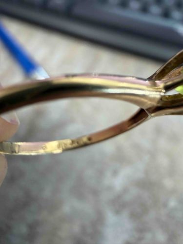 This item is a slender solitaire ring crafted from yellow gold, featuring a vibrant green gemstone focal point. The band is a traditional thin shank that tapers slightly as it approaches the head of the ring. Within the interior of the shank, multiple hallmark stamps are visible, including a '10K' mark indicating the gold purity and an additional maker's mark or symbol, possibly an 'S' or stylized logo, suggesting a mid-to-late 20th-century manufacture. The gemstone is held in a multi-prong basket setting, or 'v-tip' style typically associated with fancy cuts like a marquise, heart, or pear shape, though only the corner is visible here. The color of the stone is a bright, yellowish-green, consistent with peridot or a synthetic variety. The gold exhibits a high-polish finish with minor surface abrasions and superficial scratches consistent with regular wear. There appears to be some minor patina or dirt accumulation near the setting and within the stamped recessed areas. The overall construction is dainty and lightweight, characteristic of everyday fine jewelry rather than a substantial heavy-cast piece.