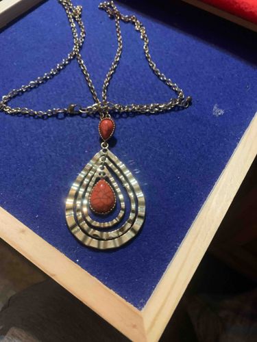 This is a statement pendant necklace featuring a multi-tiered teardrop design in a gold-tone metallic finish. The central pendant is composed of three concentric, open-frame teardrop shapes with a hammered or textured surface that reflects light across its undulating waves. Suspended within the innermost frame is a teardrop-shaped faux stone of brick-red or burnt orange color, exhibiting a dark spider-web matrix pattern characteristic of dyed howlite or turquoise. A second, smaller matching stone is situated at the top bail where the pendant connects to the chain. The necklace is supported by a medium-gauge link chain with an adjustable length extension and a lobster-style clasp. The construction appears to be costume jewelry made from base metal (likely an alloy) with a plated finish. The overall aesthetic suggests a Southwestern or Bohemian style popular in contemporary fashion from the early 21st century. Condition appears to be good with no obvious signs of metal fatigue or stone loss, though the matte finish shows typical minor surface wear. No visible maker's marks are identifiable in the image, suggesting a mass-market production origin.