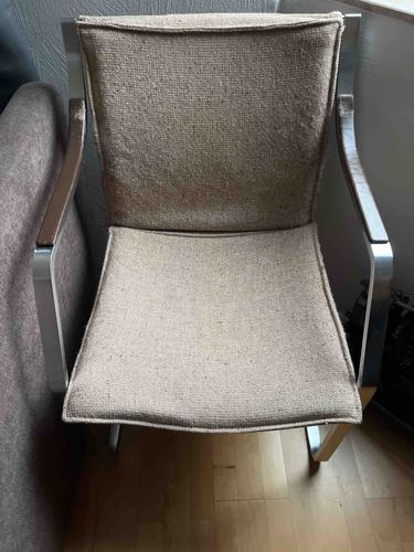 This is a mid-century modern style armchair featuring a rectangular profile with a cantilever-inspired frame. The primary structure is composed of flat-bar polished chrome or brushed steel, providing a sleek, industrial aesthetic characteristic of late 20th-century design. The arms are topped with solid wood caps, which appear to be walnut or teak, exhibiting a dark grain. The seat and backrest are upholstered in a coarse, light-beige or oatmeal-colored textured fabric, possibly a heavy linen or wool blend, accented with welted seams. The overall construction highlights a minimalist geometry with exposed metal rivets or joins. Regarding condition, there is prominent wear and finish loss on the leading edges of the wooden arm caps, suggesting heavy use. The fabric shows minor pilling and softening of the edges, though no large tears are visible. No maker's marks or tags are immediately discernible from this angle, but the craftsmanship reflects the high-quality production standards typical of European designers from the 1960s or 1970s. The patina on the metal and the wear on the wood suggests an original vintage state rather than a reproduction.