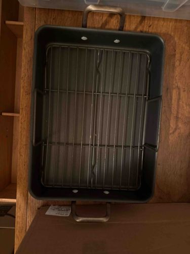 This is a rectangular roasting pan featuring a dark charcoal-colored non-stick coating over a heavy-duty aluminized steel or cast aluminum body. The item includes a matching removable wire roasting rack that fits inside the pan, designed with elevated handles for easy lifting and a grid structure to allow heat circulation around the food. The pan itself is equipped with two large, upright, stainless steel or cast aluminum riveted handles on the narrow sides, which show a bronzed or brushed metallic patina. Based on the construction and handle design, this appears to be a contemporary high-quality kitchen tool, likely produced within the last 10 to 20 years. The craftsmanship is evident in the secure double-rivet attachment points for the handles, ensuring structural integrity for heavy loads like a turkey or roast. Condition-wise, the item shows moderate signs of use; there are visible scuffs and minor scratches on the interior non-stick surface and along the edges of the wire rack where metal-on-metal contact occurs. There is slight discoloration on the handles, characteristic of heat exposure from oven use. No significant warping or deep chips in the coating are visible in the provided top-down view.
