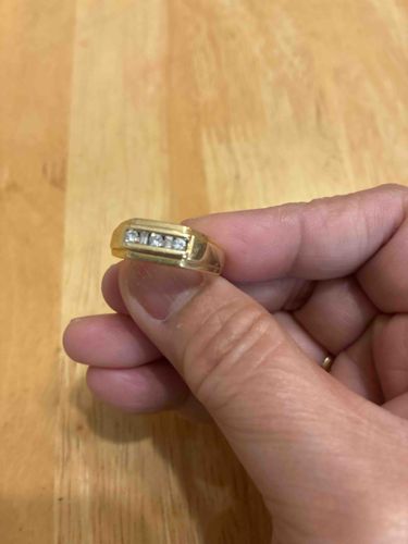 This is a contemporary men's band, likely crafted from 10k or 14k yellow gold, featuring a horizontal channel-set layout. The centerpiece of the ring consists of three round brilliant-cut diamonds, interspersed with two smaller rectangular baguette-cut diamonds, creating a rhythmic and balanced aesthetic. The yellow gold has a vibrant, polished finish with a wide, substantial shank that tapers slightly toward the back. The channel setting is designed to secure the stones flush with the metal surface, offering a sleek profile that resists snagging. In terms of condition, the metal shows a modest amount of surface patina and fine micro-scratches consistent with regular wear, particularly along the lower shank. The stones appear clear with no obvious chips to the crown facets visible to the naked eye. While no maker's marks are visible in this orientation, the style and construction suggest a late 20th-century or early 21st-century production, likely mid-market commercial jewelry. The craftsmanship is professional, with clean channel lines and consistent stone alignment, indicating a durable piece intended for daily use.