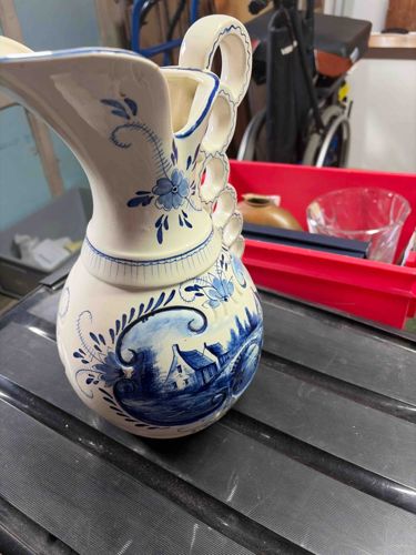 This item is a decorative ceramic pitcher or ewer, featuring a classic blue and white tin-glazed earthenware aesthetic associated with Delftware. The vessel is constructed with a bulbous circular body that narrows into a cinched waist before flaring out at the neck into a wide, scalloped spout. A highly distinctive features is the vertical 'ring' handle, which consists of several stacked ceramic loops, providing a decorative and tactile element. The glaze is an off-white or cream base, decorated with hand-painted cobalt blue iconography. The body features a central scenic medallion depicting a traditional watermill and farmhouse in a rural Dutch landscape, framed by scrollwork and floral sprigs. The neck and spout are further adorned with delicate floral patterns and scroll motifs. While the exact maker's marks are not visible from this angle, the style suggests a mid-20th-century production, likely from a manufacture such as Royal Delft or a similar Dutch workshop. The condition appears fair to good; there is visible surface dirt, and while no major chips are immediately apparent on the outer rim, ceramic of this type is prone to crazing and kiln stilt marks. The painting shows varying degrees of brushstroke saturation, a hallmark of hand-decorated pieces.