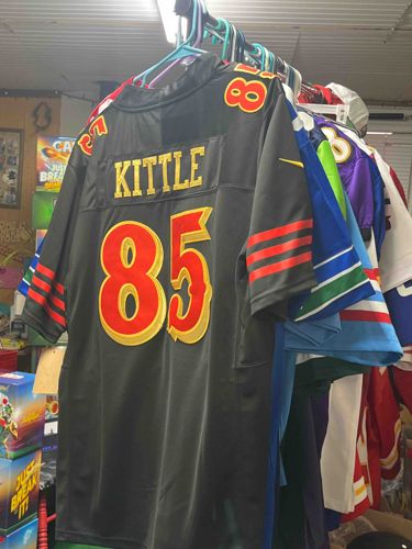 This is a contemporary Nike-manufactured 'Vapor Limited' model fan jersey for San Francisco 49ers tight end George Kittle (number 85). The garment is constructed from a black polyester mesh and stretch fabric blend, featuring a heat-pressed or embroidered twill nameplate 'KITTLE' in gold letters with red trim. The large '85' on the back is rendered in a multi-layered tackle twill style with a red base and gold shadow/outline accents. The sleeves feature three red horizontal stripes, and the shoulders display smaller player numbers consistent with the 49ers' alternate uniform design. It includes a visible Nike swoosh logo on the sleeve and appears to have the 'Vapor' chainmail mesh grill at the neckline, indicative of the 2017+ Nike NFL product line. The condition appears to be excellent with no visible thread fraying, fading, or staining on the black fabric. It shows a modern athletic cut with stitched detailing rather than screen printing, marking it as a higher-tier fan replica. The item is unsigned and has been stored on a hanger, maintaining its structural integrity and shape.
