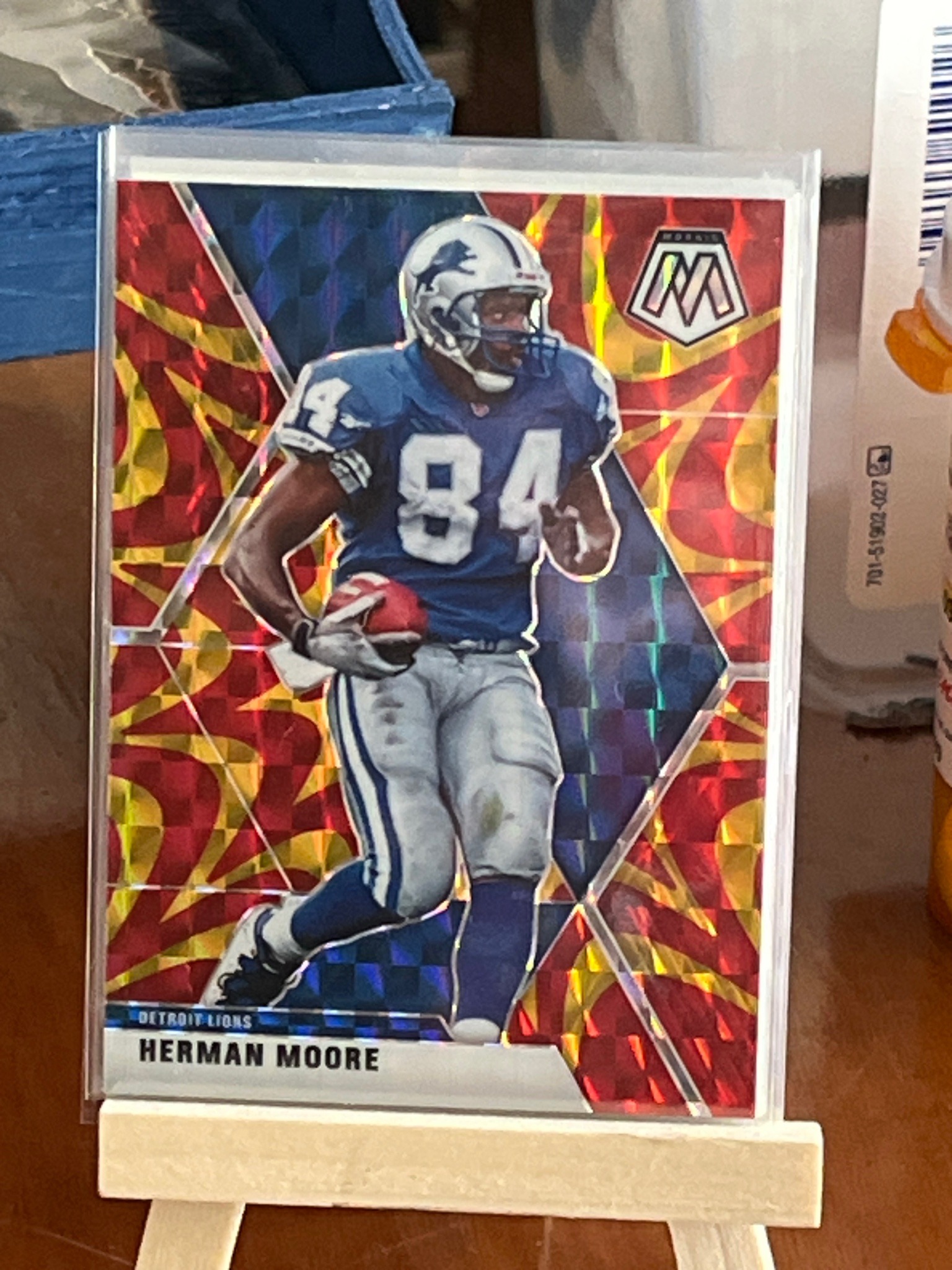 This is a 2021 Panini Mosaic football trading card featuring retired Detroit Lions wide receiver Herman Moore. The card is a 'Mosaic' parallel, characterized by a complex, multi-textured holographic background with a 'Red and Yellow Fusion' color scheme. This specific design features vibrant flame-like patterns in red and yellow surrounding a central blue-tiled mosaic diamond. Moore is depicted in action wearing his home Detroit Lions blue jersey with the number 84 and a silver helmet. The 'Mosaic' brand logo is prominently displayed in the upper right, while the player's name and team are located at the bottom left. Physically, the card appears to be standard 2.5 by 3.5 inches with a chrome-finished cardstock that provides a reflective, premium feel. The card is currently housed in a transparent soft sleeve and a rigid top-loader, resting on a small wooden display easel. Visually, the centering appears horizontal with slightly thicker borders on the right than the left. The corners and edges, protected by the sleeve, appear sharp with no obvious chipping or whitening. There are no visible surface scratches or print lines, suggesting the item is in near-mint to mint condition, though a full professional grade would be required for confirmation.