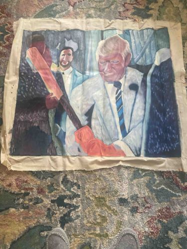 This item is an original figurative painting executed in a folk art or outsider art style, depicting former President Donald Trump alongside two other individuals. The medium appears to be acrylic or oil paint applied to a rectangular piece of heavy, off-white, unstretched canvas or duck cloth. The central figure is recognizable as Donald Trump, wearing a white shirt, a blue and white striped tie, and orange-toned gloves, holding a long thin object that suggests a tool or sporting implement. The figures are rendered with simplified features and a somewhat distorted color palette, particularly in the pinkish flesh tones of the faces. In the background, a man with a beard in a light suit looks on. The canvas displays significant signs of wear, including heavy creasing, rippling, and frayed edges, indicating it has been folded or stored loosely without a frame or stretcher bars. Minor paint loss and surface abrasions are visible near the fold lines. There are no visible artist signatures or maker's marks in the current view. The work likely dates to the mid-to-late 2010s, coinciding with Trump's presidency, and represents a piece of contemporary political folk art characterized by its raw, unpolished execution and unconventional material usage.
