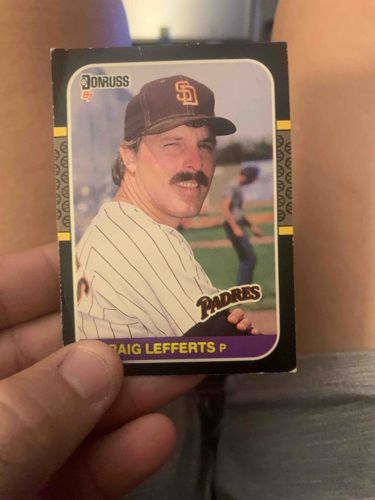 This is a standard 2.5 by 3.5 inch baseball card from the 1987 Donruss set, featuring pitcher Craig Lefferts of the San Diego Padres. The card's aesthetic is defined by the iconic black borders characteristic of the 1987 Donruss release, accented by gold and gray horizontal striped bands on the sides. The center image shows a smiling Lefferts wearing a brown Padres cap and a white pinstriped jersey. The Donruss logo and '87' year indicator are present in the upper left corner, while the player's name and position are located in a purple banner at the bottom. Regarding condition, the card shows significant signs of wear typically found in 'raw' ungraded vintage cards. Notable issues include 'chipping' along the sensitive black edges, blunted or frayed corners, and white edge wear visible on the left and bottom right sides. The centering appears slightly shifted toward the top and left. This card represents a mass-produced era of sports collectables often referred to as the 'Junk Wax' era, meaning while it holds nostalgic value, its market scarcity is low.