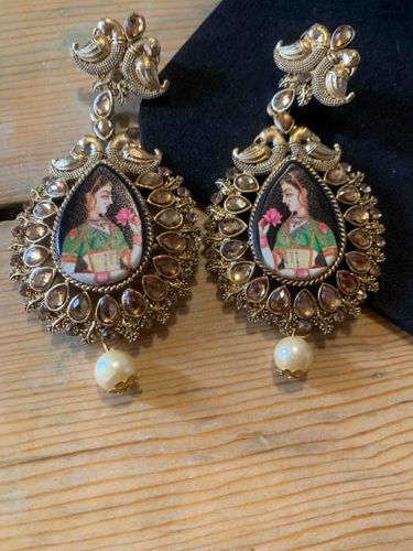 A pair of ornate dangling earrings featuring classic Indian miniature painting motifs. Centrally positioned in each earring is a teardrop-shaped focal point depicting a noblewoman or 'Nayika' holding a pink lotus flower, rendered in the style of Rajasthani or Mughal artwork with green and red traditional attire. These centerpieces are encased in a gold-toned metallic frame with a twisted wire border. Surrounding the center are rows of Kundan-style champagne-colored glass or resin stones set in a floral halo arrangement. The top stud portion consists of stylized peacock or avian motifs, also embellished with stones. The earrings terminate in a single faux pearl drop with a small decorative gold-toned cap. The metal appears to be an oxidized gold-plated base alloy, characteristic of contemporary costume jewelry influenced by traditional Jodhpur or Jaipur heritage designs. The condition appears fair to good, with some slight misalignment in the stone settings and minor tarnishing on the metal surface consistent with handcrafted fashion jewelry. There are no visible maker's marks, suggesting mass-production or boutique artisanal manufacture. The craftsmanship balances traditional aesthetics with modern materials to create a statement piece reflecting high-fashion South Asian bridal or festive wear trends.