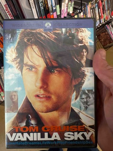 This is a physical DVD copy of the 2001 film 'Vanilla Sky' starring Tom Cruise. The item is housed in a standard black plastic amaray case with a clear plastic overlay holding the printed cover art. The front cover features a large portrait of Tom Cruise, flanked by smaller inset images of Penelope Cruz and Cameron Diaz. At the top, a blue banner denotes it as part of the 'WIDESCREEN COLLECTION' and features a Paramount 90th Anniversary logo, dating this specific release to approximately 2002. The title is prominently displayed in a bold, white sans-serif font at the bottom, above a tagline line of text: 'LoveHateDreamsLifeWorkPlayFriendshipSex'. The construction consists of a polypropylene case and a printed paper insert. The condition appears to be used, with light surface wear on the exterior plastic sleeve and minor shelf-wear visible at the corners. The colors remain vibrant with no significant sun fading. The item represents a mass-produced media format from the early 2000s, popular before the dominance of digital streaming. Such releases often included bonus features like director commentary and behind-the-scenes footage, which were hallmark value-adds for physical media collectors of that era.