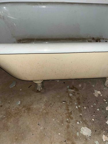 This is a vintage cast iron clawfoot bathtub, likely manufactured in the early 20th century, circa 1900-1930. The piece features a white porcelain enamel interior with a wide, rolled rim typical of the period. Externally, the tub appears to have an aged cream-colored finish that shows significant staining, dirt, and surface grime. The tub is supported by decorative cast iron 'ball and claw' or 'eagle claw' style feet, which exhibit dark patina and potential surface oxidation. Physically, the item shows substantial evidence of long-term use and neglect. The porcelain interior contains significant dark staining around the base and drainage area, suggesting mineral deposits or standing water damage. There are visible surface scratches and some pitting in the enamel. The exterior casing displays heavy speckling and discoloration. While no specific maker's mark is visible in the provided image, such tubs were commonly produced by firms like Kohler or Standard. This tub represents classic industrial craftsmanship but requires extensive professional restoration, including re-enameling of the interior and stripping/refinishing of the exterior and feet to return to its original luxury residential quality.