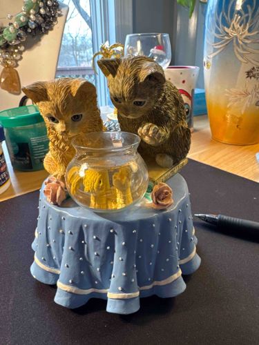 This is a decorative three-dimensional musical figurine featuring two kittens peering into a small glass fishbowl containing a yellow fish. The piece is constructed primarily from cast resin or a cold-cast porcelain material, allowing for highly textured fur detailing on the orange tabby and gray-brown kittens. The figurines rest on a base sculpted to look like a draped blue circular tablecloth with white polka dots and a white trim border. Two small pink roses accent the top of the base. The fishbowl is a separate clear glass component, possibly containing gel or liquid to simulate water. The kittens appear to be sitting on a gold-toned book, which may contain identifying text, though some is obscured. The overall style is a sentimental, late 20th-century collectible aesthetic, typical of brands like San Francisco Music Box Company or Schmid. The craftsmanship shows careful hand-painting, particularly on the kittens' expressive eyes and the individual dots on the tablecloth. Condition appears excellent with no visible chips or cracks in the resin or glass. The piece likely dates to the 1990s or early 2000s and functions via a wind-up musical mechanism housed within the blue base.