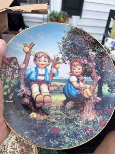 This is a circular porcelain collector plate featuring a three-dimensional effect illustration based on the artwork of Sister Maria Innocentia Hummel. The central scene depicts a young boy and girl sitting on gnarled apple tree branches, characteristic of the 'Apple Tree Boy' and 'Apple Tree Girl' figurines. The children are dressed in traditional Bavarian-style attire with vibrant blue jackets and jumpers. The plate features a fine gold-gilded rim and a background depicting a scenic European countryside with a half-timbered house and a distant horizon under a pale blue sky. The craftsmanship shows high-quality decal application with saturated colors and fine stippling to mimic the original ceramic texture. The signature 'M.I. Hummel' is visible on the left side of the artwork. This piece likely dates from the late 20th century (1980s-1990s), a period of high production for Goebel decorative plates. The condition appears excellent with no visible chips, cracks, or fading to the pigments. The gold gilding on the edge remains intact without significant rub-off, suggesting it has been kept for display rather than utility. It likely belongs to a specific limited edition 'Little Companions' or similar commemorative series produced by the Goebel porcelain factory in Germany.