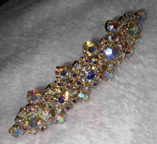 This is a multifaceted vintage brooch featuring a dense arrangement of Aurora Borealis (AB) finished rhinestones set into a gold-tone metal frame. The item is characterized by its elongated, somewhat scalloped or tiered design, measuring approximately 3 to 4 inches in length. The rhinestones exhibit a characteristic iridescent shimmer, reflecting a spectrum of colors including blue, pink, yellow, and violet depending on the angle of light. Most stones are held in individual four-prong claw settings, which is a hallmark of mid-20th-century costume jewelry craftsmanship. Small purple accent stones are interspersed among the larger AB crystals to add depth and contrast. Based on the cut and the use of the AB coating (invented by Swarovski in 1955), this piece likely dates to the late 1950s or 1960s. The metal backing appears to be a bright gold-plated base metal. The condition appears to be fair to good for its age; while all major stones seem to be present, some of the AB coatings show slight surface wear or dulling, and there may be minor verdigris or tarnish on the metal prongs. No maker's marks are visible from the top view, though such pieces were common from designers like Weiss or Coro.