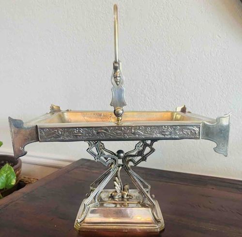 This item is a meticulously crafted rectangular serving basket, presented on a decorative pedestal with a central swing handle, attributed to Wilcox Silver Plate. The piece is constructed from silver-plated metal, displaying a lustrous, albeit somewhat tarnished, finish characteristic of antique silver plate. The primary serving tray is elongated and rectangular, featuring intricately embossed or engraved decoration along its four sides. This ornamentation appears to depict a classical or naturalistic motif, possibly with figures, foliage, and scrollwork, though precise details are obscured by the angle and reflectivity. The corners of the tray extend outward with pointed, almost wing-like elements, adding to its decorative appeal. The tray rests on a substantial, openwork pedestal base. This base is formed by four ornate, curved supports that converge towards a central sphere, then flare out to a rectangular footed plinth. At the base of the plinth, flanking what appears to be a central finial or miniature pedestal, are two small, zoomorphic figures, possibly griffins or similar mythical creatures, adding a whimsical yet elegant touch. The prominent swing handle rises from the center of the tray, adorned with a classical male head or grotesque mask at its pivot point, indicating attention to detail and a possible Neoclassical or Art Nouveau influence. The overall construction suggests a robust and decorative serving piece, likely from the late 19th or early 20th century, a period known for elaborate silver plate designs. The visible condition shows areas of tarnish and slight loss of plating in places, common with age and use, but no overt damage or significant repairs are apparent. The craftsmanship is evident in the detailed casting and applied ornamentation.