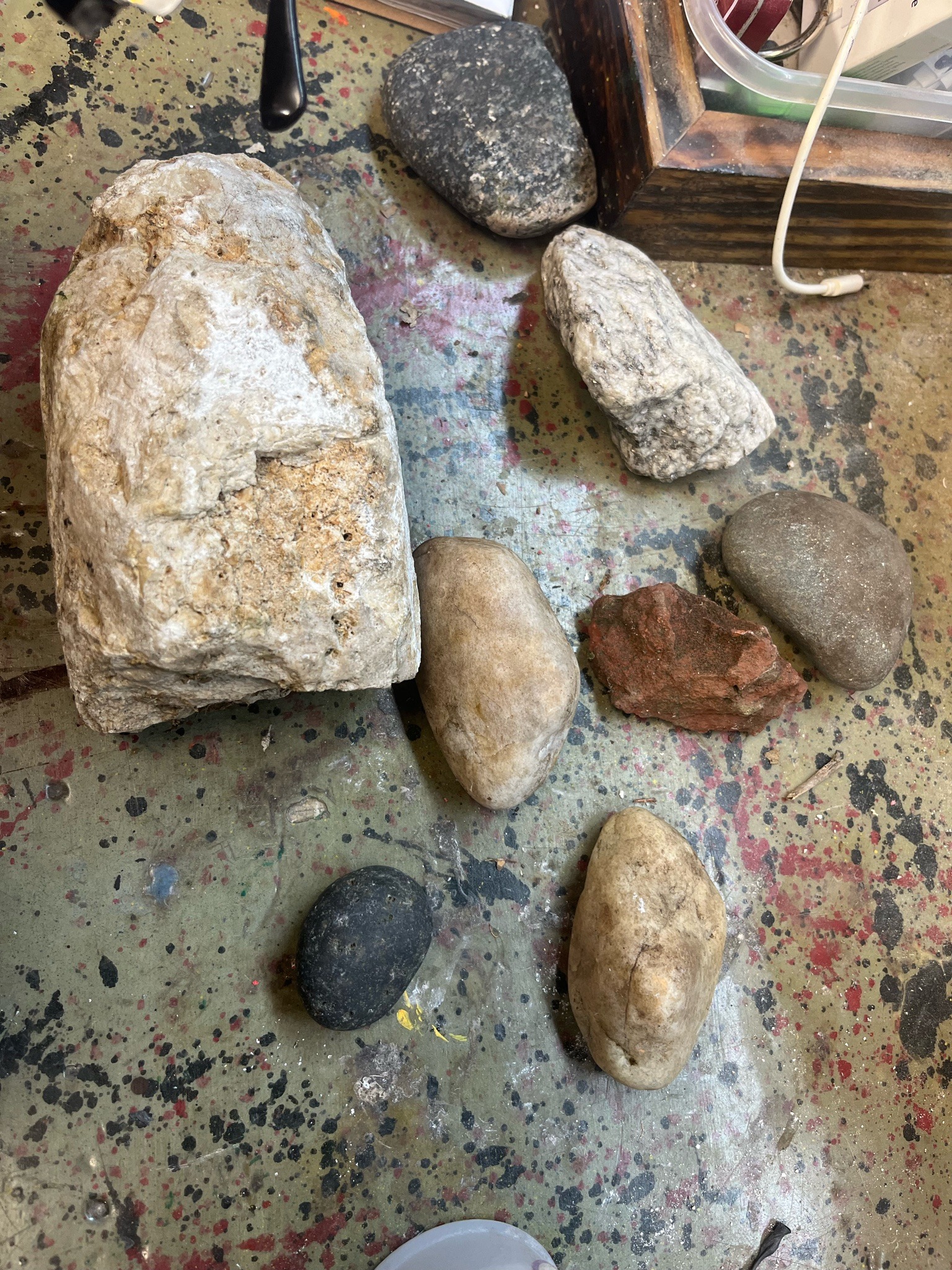 This is a heterogeneous collection of eight individual rock and mineral specimens, varied in size, color, and geological composition. The largest specimen is an angular, off-white to tan block of what appears to be a carbonate rock or tufa, exhibiting a porous, pitted surface and oxidized iron staining. Smaller specimens include several water-worn river stones with smooth, ovate shapes in shades of tan, dark grey, and charcoal, suggesting a history of fluvial erosion. A notable piece is a sharp, angular fragment of reddish-brown sedimentary or metamorphic rock, possibly sandstone or shale, showing distinct layering and iron-rich pigmentation. Another specimen features a crystalline, granular texture consistent with quartz or feldspar. The items vary in size from approximately two inches to over six inches in length. They are shown in a raw, unpolished state, with visible surface dirt, natural abrasions, and weathering. There are no identifiable maker's marks, as these are natural geological finds. The collection represents a cross-section of common sedimentary, igneous, and metamorphic materials, potentially reflecting local geology or a hobbyist's field collection. Their condition is natural and untreated, with various degrees of textural roughness and mineral oxidation consistent with long-term exposure to the elements.