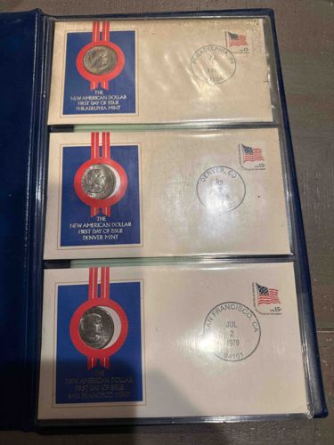 This is a set of three First Day of Issue numismatic covers featuring the Susan B. Anthony one-dollar coin, housed within a dark blue protective display album. Each cover commemorates the first day of issue for the coin on July 2, 1979. The set is particularly significant because it includes one cover from each of the three major United States Mints: Philadelphia (PA), Denver (CO), and San Francisco (CA). Each white envelope (cachet) features an encapsulated Susan B. Anthony dollar coin on the left side, surrounded by a red, white, and blue patriotic graphic. To the right, each cover is franked with a 15-cent American Flag postage stamp and bears a circular black ink cancellation mark corresponding to its specific mint city and the date July 2, 1979. The coins themselves are copper-nickel clad and feature the profile of the women's suffrage leader. The condition appears to be well-preserved within plastic sleeves, though some light foxing or yellowing typical of paper aging is visible on the envelopes. The cancellation marks are clear and legible. This collection represents a specific moment in numismatic history when the US Mint attempted to introduce a smaller dollar coin to the public.