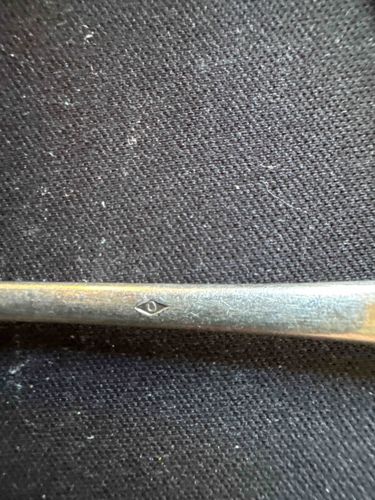 This item is a piece of fine metalwork, specifically a piece of flatware or a decorative implement forged from a silver-colored metal. The construction features a long, slender handle with a subtle tapered profile. A critical distinguishing element is the presence of a small, diamond-shaped (lozenge) hallmark, or poinçon, stamped into the metal surface. In French silversmithing traditions, the lozenge-shaped mark is indicative of an "orfèvre" or maker's mark. The symbol inside the mark appears to be a stylized letter or icon, used to identify the specific workshop or craftsman. The metal exhibits a matte, brushed finish with a visible network of micro-scratches and a soft patina, suggesting age and light use rather than recent manufacture. The condition is generally good, showing no signs of major structural deformity or deep corrosion, though the surface wear indicates it has been handled. Based on the style of the hallmark, this piece likely originates from France, possibly from the late 19th to mid-20th century. The precision of the mark and the smooth finish of the metal reflect high-quality manufacturing standards typical of European silver plate or solid silver production.