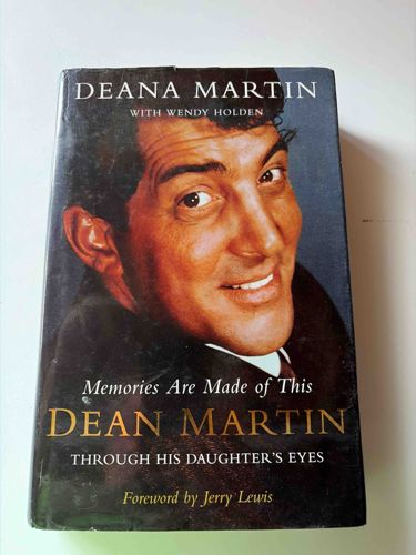 This is a hardcover biographical book written by Deana Martin with Wendy Holden, featuring a foreword by Jerry Lewis. The front cover displays a large, full-color close-up photograph of Dean Martin, exhibiting his characteristic charming smile. The title 'Memories Are Made of This' is printed in white cursive-style script, while 'DEAN MARTIN' is prominently displayed in gold serif lettering. The dust jacket shows visible signs of wear, particularly along the edges and corners with several small chips and creases at the top and bottom. There is notable scuffing and minor surface scratches on the black background of the cover, along with some slight discoloration or dust accumulation indicative of shelf age. The binding appears intact but shows slight compression at the spine ends. Published circa 2004, this first-edition-style book serves as a personal memoir of the legendary entertainer's life. The printing quality is standard for commercial hardcovers of the early 21st century, utilizing a glossy finish for the dust jacket and standard offset printing for the high-contrast cover image. No internal pages are visible, but the external condition suggests a well-read copy.