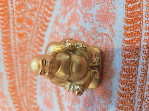 This item is a small, seated figurine representing the Laughing Buddha, also known as Budai or Hotei in East Asian folklore. The figure is depicted in a traditional joyful sitting pose with an exposed large belly, symbolizing abundance and prosperity. He is holding a cloth sack or prayer beads in his right hand, which is resting on his knee. The figurine is finished in a bright gold gilding or gold-toned paint, characteristic of decorative spiritual icons meant to bring good luck. Made of a cast material, likely resin or a heavy base metal, it features smooth contours and stylized facial features including squinted eyes and a wide grin. The surface shows minor wear and light surface abrasions, particularly on the rounded portions of the head and belly, suggesting it may have been handled for luck. There are no immediately visible maker's marks or signatures on the upper surface. The piece appears to be a contemporary or mid-20th-century mass-produced decorative object rather than an antique hand-sculpted piece, though it retains good definition in the casting of the robes and physical features. The overall height appears to be roughly 2 to 4 inches, making it suitable for a home altar or desk ornament.