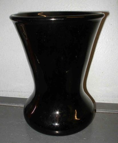 This is a vintage flower vase crafted from deep black glass, likely 'Black Amethyst' glass which appears opaque black but reveals a dark purple hue when held against strong light. The piece features a classic hourglass or flared trumpet silhouette, characterized by a bulbous rounded base that tapers into a cinched waist before expanding outward into a wide, flared rim. The rim is finished with a smooth, rounded edge, suggesting a mold-blown construction followed by fire-polishing. The surface exhibits a high-gloss, reflective mirror-like finish typical of mid-20th-century decorative glassware. There are no visible maker's marks or signatures on the exterior, which is common for mass-produced glass from manufacturers like L.E. Smith, Fenton, or Hazel-Atlas, typically dating from the 1930s to the 1950s. The condition appears to be excellent with no visible chips, cracks, or heavy scouring, though minor surface scratches and shelf wear on the base are expected for an object of this age. The glass exhibits good clarity and weight, indicating solid craftsmanship and quality control during production.