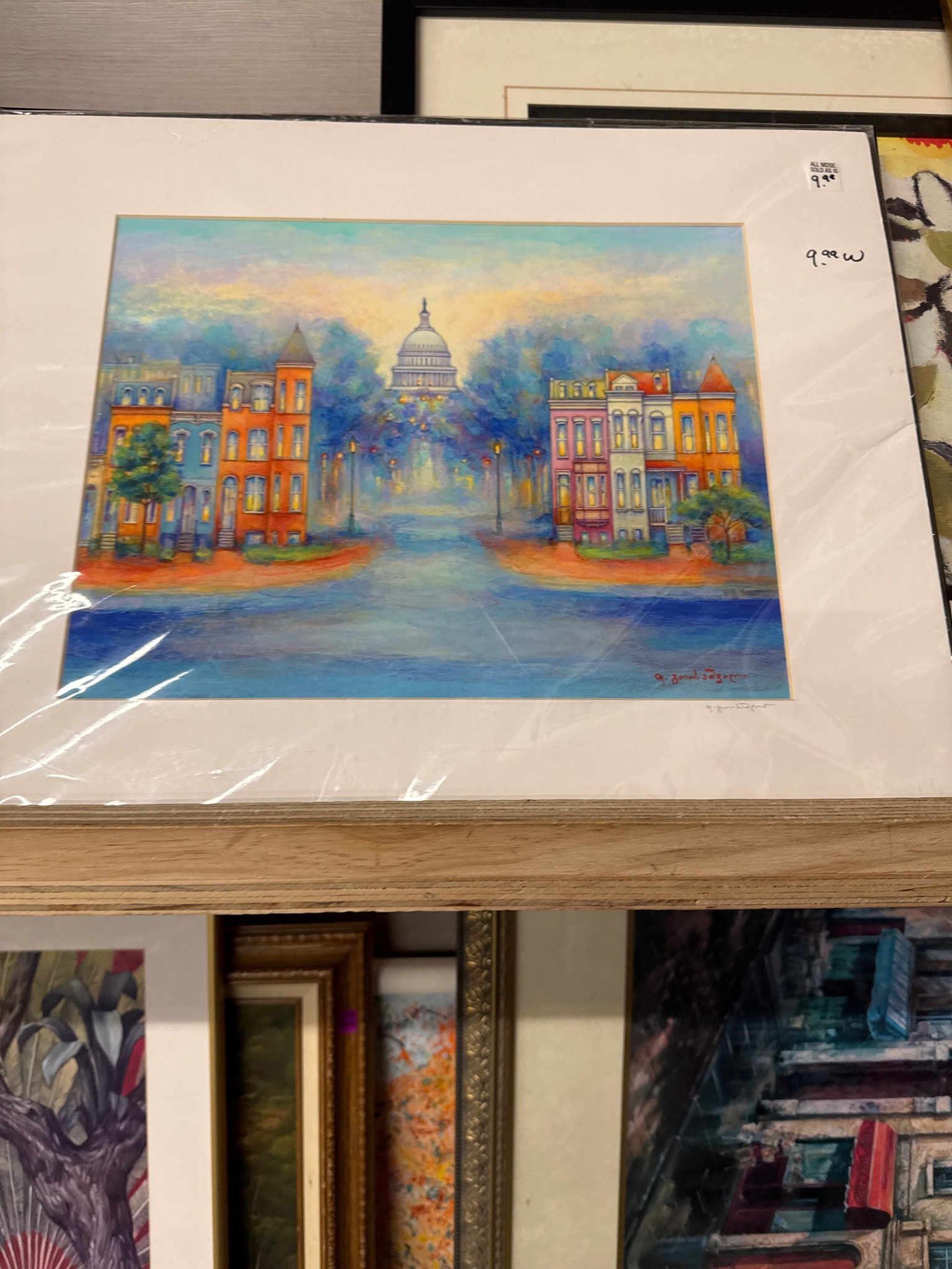 This item is a contemporary fine art print depicting a stylized cityscape of Washington D.C., featuring Capitol Hill in the background framed by colorful row houses. The artwork is characterized by a vibrant Post-Impressionist palette of oranges, blues, and magentas. The medium appears to be a high-quality giclée or offset lithography print on paper, meticulously matted with a professional white beveled-edge mat. The physical dimensions appear to be approximately 11x14 or 16x20 inches including the mat. A notable feature is the artist's signature in the lower right corner, written in Kartvelian (Georgian) script, identifying it as the work of the contemporary Georgian artist Givi Siproshvili. The construction features a standard art store presentation, currently wrapped in protective cellophane for retail sale. The condition is excellent, showing no visible foxing, fading, or moisture damage, though the protective plastic is wrinkled. The style is reminiscent of early 20th-century European expressionism but produced in the late 20th or early 21st century. The quality of the printing shows fine detail in the architectural elements and smooth transitions in the sky's pastel gradients, indicative of a professional-grade reproduction.