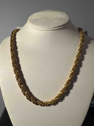 This item is a substantial rope-style chain necklace, likely crafted from yellow gold or a high-quality gold-tone metal. The necklace features a classic spiral construction where multiple oval links are interwoven and twisted together to create a thick, rope-like appearance. This specific design is a heavy-gauge variant, measuring approximately 6mm to 8mm in thickness, suggesting a significant weight and durability. The metal displays a bright, high-polish finish that effectively catches and reflects light from multiple angles due to the faceted nature of the interlocking links. Regarding the style and age, the rope chain is a timeless jewelry staple that gained peak popularity in the 1980s and 1990s, though it remains a contemporary favorite for both men and women. The overall condition appears excellent with no visible kinks, broken links, or significant tarnish. The craftsmanship is consistent throughout the length of the piece, with tightly wound links indicating high-quality mechanical production. While specific maker's marks or purity stamps (such as 10k, 14k, or 18k) are not visible on the main body of the chain in this photograph, they would typically be located on the clasp or end-caps. The necklace is presented on a white jewelry bust, highlighting its 'princess' or 'matinee' length, likely falling between 18 and 22 inches in total circumference.