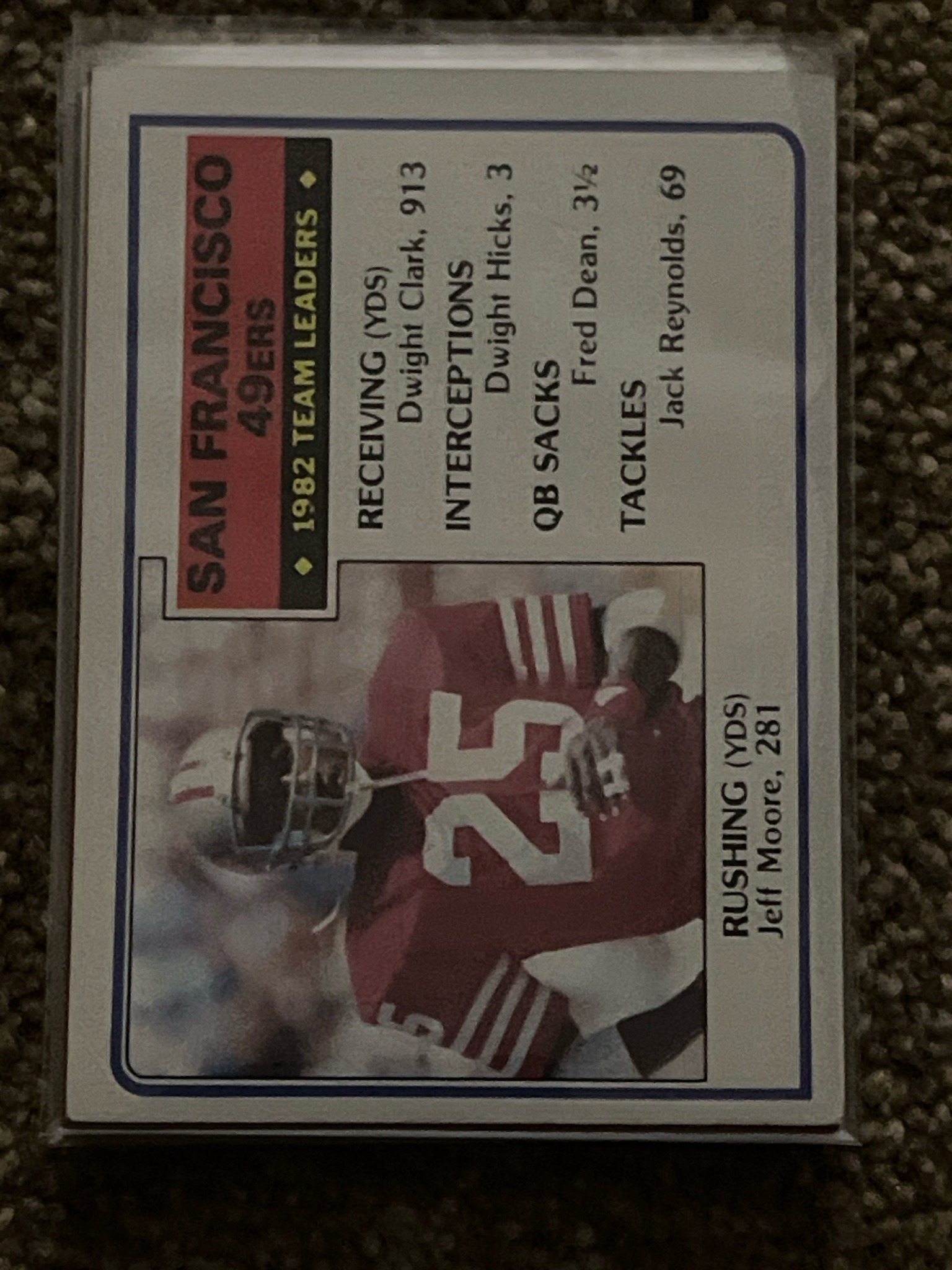 This is a vintage standard-sized (2.5" x 3.5") trading card from the 1983 Topps Football set, specifically card number 219, titled 'San Francisco 49ers 1982 Team Leaders'. The card features a white cardstock base with a blue border framing the content. The layout includes a red and black vertical banner on the top left that identifies the team and '1982 Team Leaders'. The right side of the card lists statistical leaders including Dwight Clark for Receiving, Dwight Hicks for Interceptions, Fred Dean for QB Sacks, and Jack Reynolds for Tackles. Below these stats is a color photograph of running back Jeff Moore (number 25) in a red 49ers jersey with white stripes, noted as the rushing leader with 281 yards. The card is currently housed in a clear protective plastic sleeve. Regarding condition, the card displays sharp corners and relatively clean edges, though there is a subtle left-to-right centering bias typical of Topps' mass production from the early 1980s. No visible creasing, surface scratches, or ink staining are present in the provided view, suggesting a well-preserved state. This card commemorates the roster immediately following the 49ers' Super Bowl XVI win.
