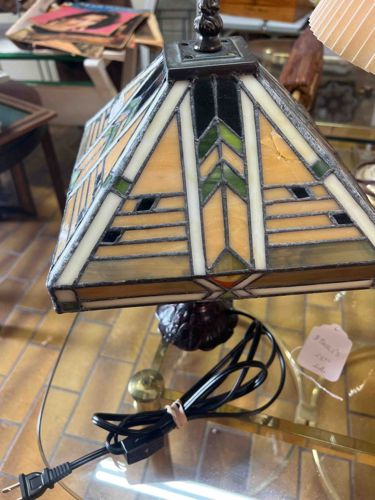 This item is a four-sided pyramid-shaped table lamp featuring a leaded slag glass shade in the Mission or Arts and Crafts style. The shade is constructed with geometric panes of cream, amber, and green slag glass, arranged in a transitional Prairie-style motif with vertical chevrons and horizontal banding. The construction utilizes copper foil and lead soldering with a dark, aged patina finish. The shade is topped with a square metal cap and a molded decorative finial. The base appears to be made of cast metal with an ornate, fluid floral or foliate design, common in late 20th-century reproductions. Visible condition issues include a significant fracture on one of the amber glass panels on the right side of the shade. Notably, the lamp is equipped with a modern black plastic cord and an inline thumb-roll switch, indicating a contemporary manufacturing date, likely from the late 1980s to the 2000s, rather than being a true period antique from the early 20th century. The quality is indicative of mass-market decorative lighting rather than studio-level craftsmanship, though it maintains a classic aesthetic.