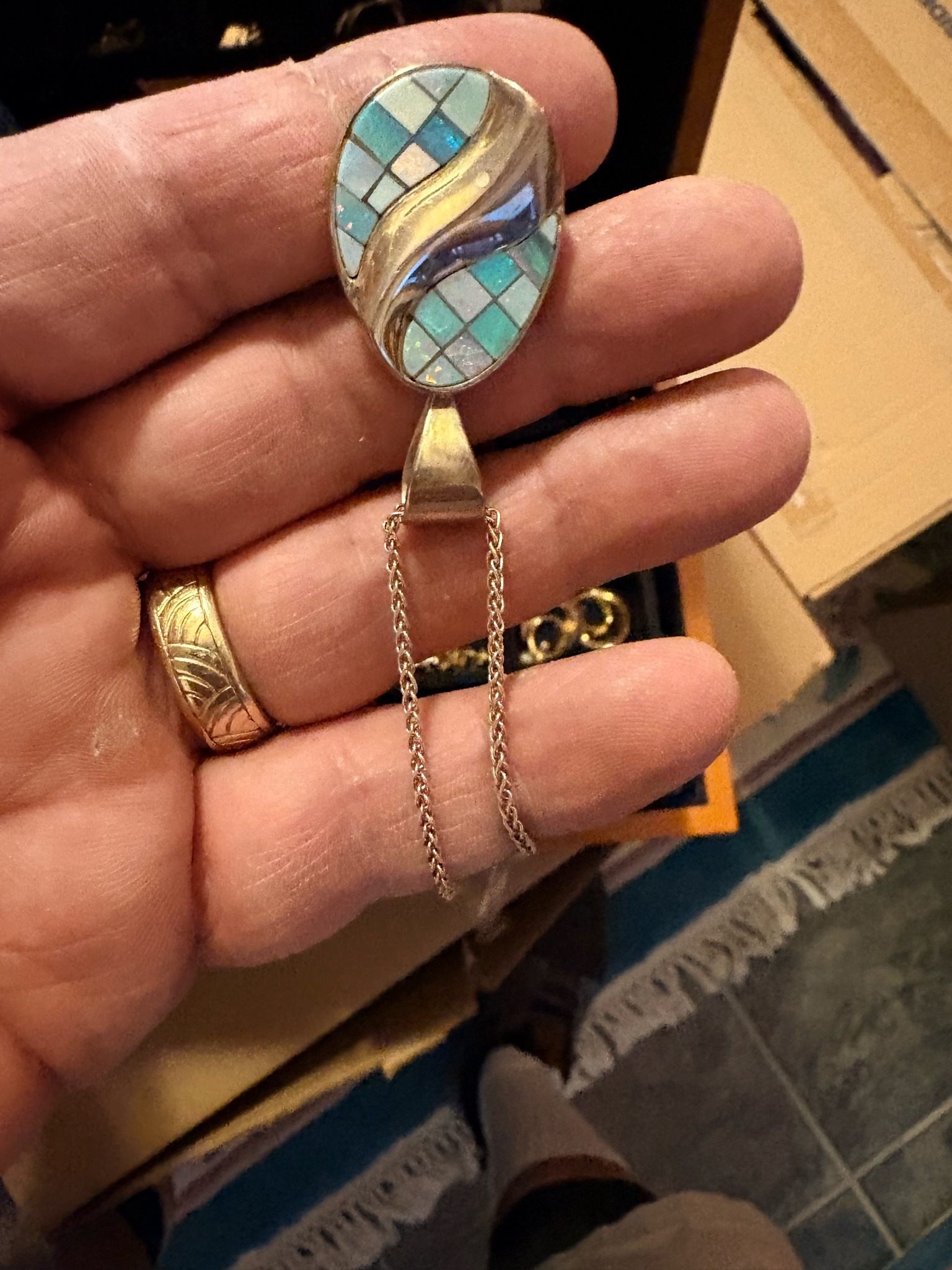 This item is a teardrop or egg-shaped modernist pendant featuring a complex multi-stone inlay. The primary decorative panels consist of a mosaic 'checkerboard' inlay of lab-created or natural white and blue-green fire opals, which exhibit a strong play-of-color. These two mosaic sections are bifurcated by a sweeping S-curved ribbon of polished metal, likely sterling silver based on the visible luster and commonality of this style in Southwestern or contemporary designer jewelry. The pendant is fitted with a large, integrated tapered bale through which a fine-link cable or wheat-link chain is threaded. The construction suggests late 20th-century craftsmanship (circa 1980s-1990s), a period popular for this aesthetic. Regarding condition, the metal surfaces show a notable warm patina and moderate surface oxidation/tarnishing, particularly in the recessed areas where the bale meets the body. There are fine micro-scratches consistent with regular wear. The inlay stones appear intact without significant cracking or missing tesserae, though the edges where the stones meet the metal frame show some slight debris buildup. No visible maker's marks are seen in this view, though they would likely be located on the reverse side.