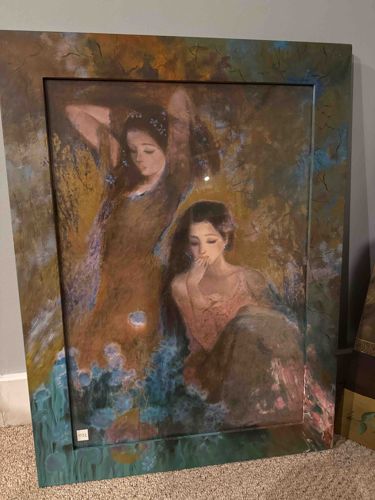 This large-scale decorative artwork features two female figures in a soft, ethereal landscape of blue and golden tones. One figure stands with arms raised to her head, while the other sits below in a contemplative pose. The style is reminiscent of mid-to-late 20th-century romanticism, likely after artists like Edna Hibel or similar popular commercial artists of the late 1970s and 1980s. The piece appears to be a heavy print on board or canvas, possibly enhanced with glazed highlights. A distinctive feature is the wide, integral-style flat frame that has been hand-decorated or printed with colors and textures that bleed directly from the artwork's palette, creating a continuous visual field of teal, brown, and gold. The overall construction is robust, utilizing a simple inset frame design within the larger decorative border. Notable conditions include visible surface texture, some minor scuffing on the frame edges, and a small white inventory or price sticker in the lower-left corner. The lighting in the image suggests a semi-gloss or satin finish that catch reflected light. No clear signature is visible from this distance, but the quality suggests a high-end commercial mass-produced decorative work intended for interior design markets.