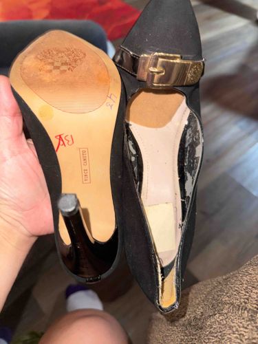 A pair of contemporary Vince Camuto women's dress heels featuring a black suede or microsuede upper construction. The design is characterized by a sleek pointed toe silhouette and a polished gold-tone buckle strap detail across the vamp, which includes a secondary medallion element. The heels are slim stilettos with a metallic or patent sheen finish. The tan-colored leather or high-quality synthetic outsoles prominently display the Vince Camuto rectangular branding and a debossed crest logo near the forefoot. Physical condition shows significant wear: the interior lining is peeling and crumbling extensively, revealing a greyish under-layer. The outsoles exhibit significant scuffing, discoloration, and handwritten markings in red and blue ink, likely from a resale or thrift environment. There is visible separation at the heel seam on the interior of one shoe. Despite the structural integrity of the outer shell, the interior degradation and exterior sole markings indicate heavy previous use and a lack of original packaging or dust bags.