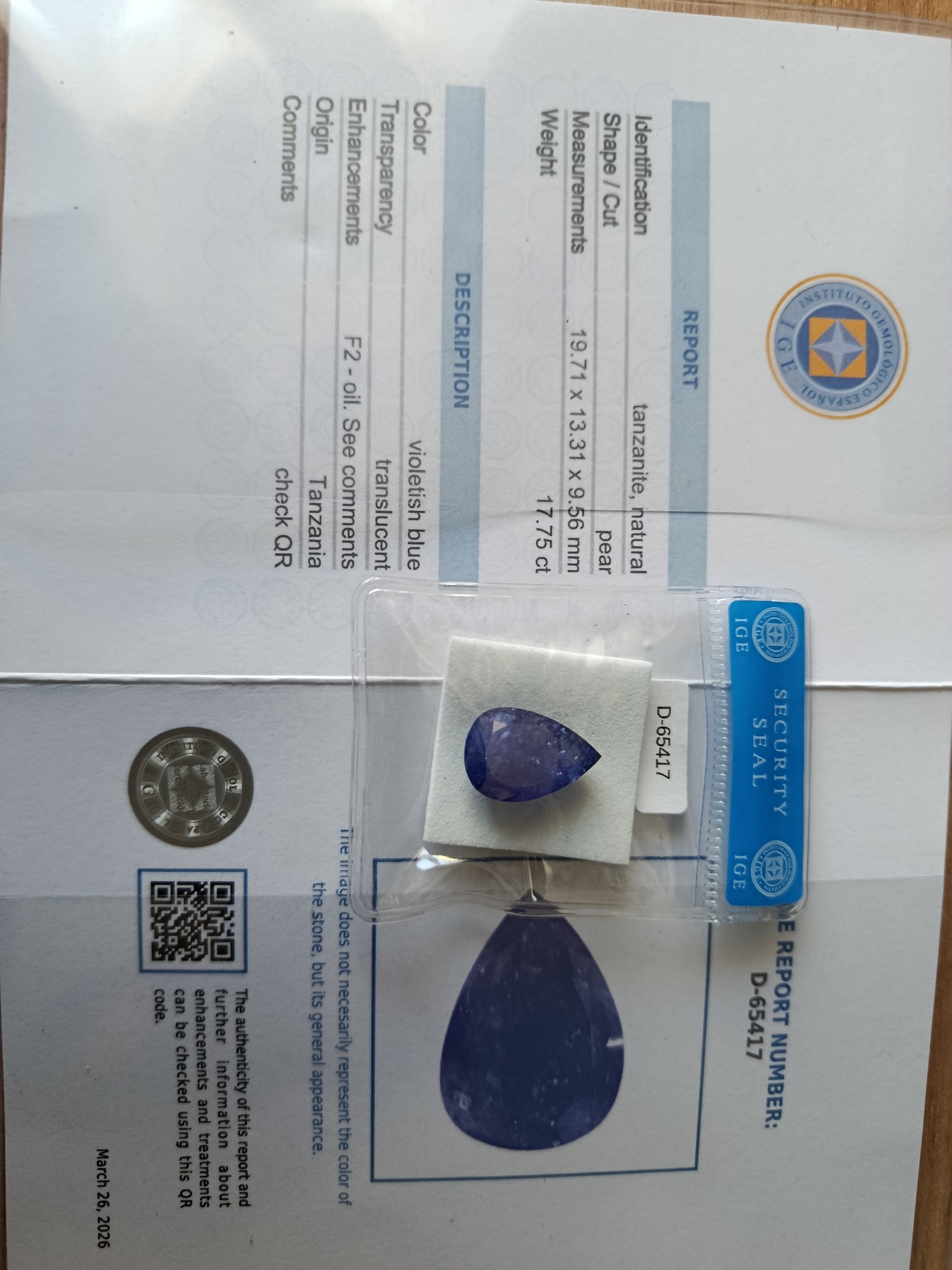 This item is a loose, natural tanzanite gemstone accompanied by a formal identification report from the Instituto Gemologico Español (IGE). The gemstone is faceted in a pear-cut shape, characterized by a rounded end tapering to a single point. According to the document, the stone weighs 17.75 carats and measures 19.71 x 13.31 x 9.56 mm. The color is described as 'violetish blue' with a 'translucent' transparency level. The stone exhibits noticeable internal inclusions and a somewhat milky or cloudy appearance, which may contribute to its translucent (rather than transparent) rating. It is currently housed in a clear protective security seal packet marked with report number D-65417. The documentation specifies the origin as Tanzania and notes an enhancement code of 'F2 - oil,' indicating moderate clarity enhancement. While the physical stone shows a pleasant violet-blue hue typical of the Zoisite variety, the inclusion levels suggest a lower grade than eye-clean specimens. The report is dated March 26, 2024, and includes a verification QR code and the official IGE seal, providing a modern standard for gemological provenance and authentication.