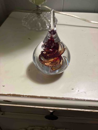 This item is a decorative solid glass paperweight featuring a classic teardrop or ovoid shape that tapers into a slender, pointed tip. It is crafted from clear lead crystal or high-quality art glass, encasing a complex internal design. The center features a swirling, organic 'hurricane' or 'tornado' motif primarily in dark cranberry, burgundy, and amber hues. Within these colored swirls, tiny 'controlled bubbles' (bullicante technique) can be seen, which add depth and light-catching interest to the piece. The construction is solid and heavy, indicative of hand-blown glass methods. The exterior surface appears smooth with a high-gloss finish, showing no immediate signs of chips or deep scratches, though minor shelf wear to the base is expected for glass of this type. While no maker's mark is visible in the image, the style is reminiscent of mid-to-late 20th-century art glass, possibly Murano or North American studio glass. The swirl is vertically oriented, giving the piece a sense of upward movement and fluid motion. There is a small internal fracture or light reflection near the top tip that warrants closer inspection during a physical appraisal. Overall, it displays good clarity and craftsmanship typical of 1970s-90s decorative accessories.