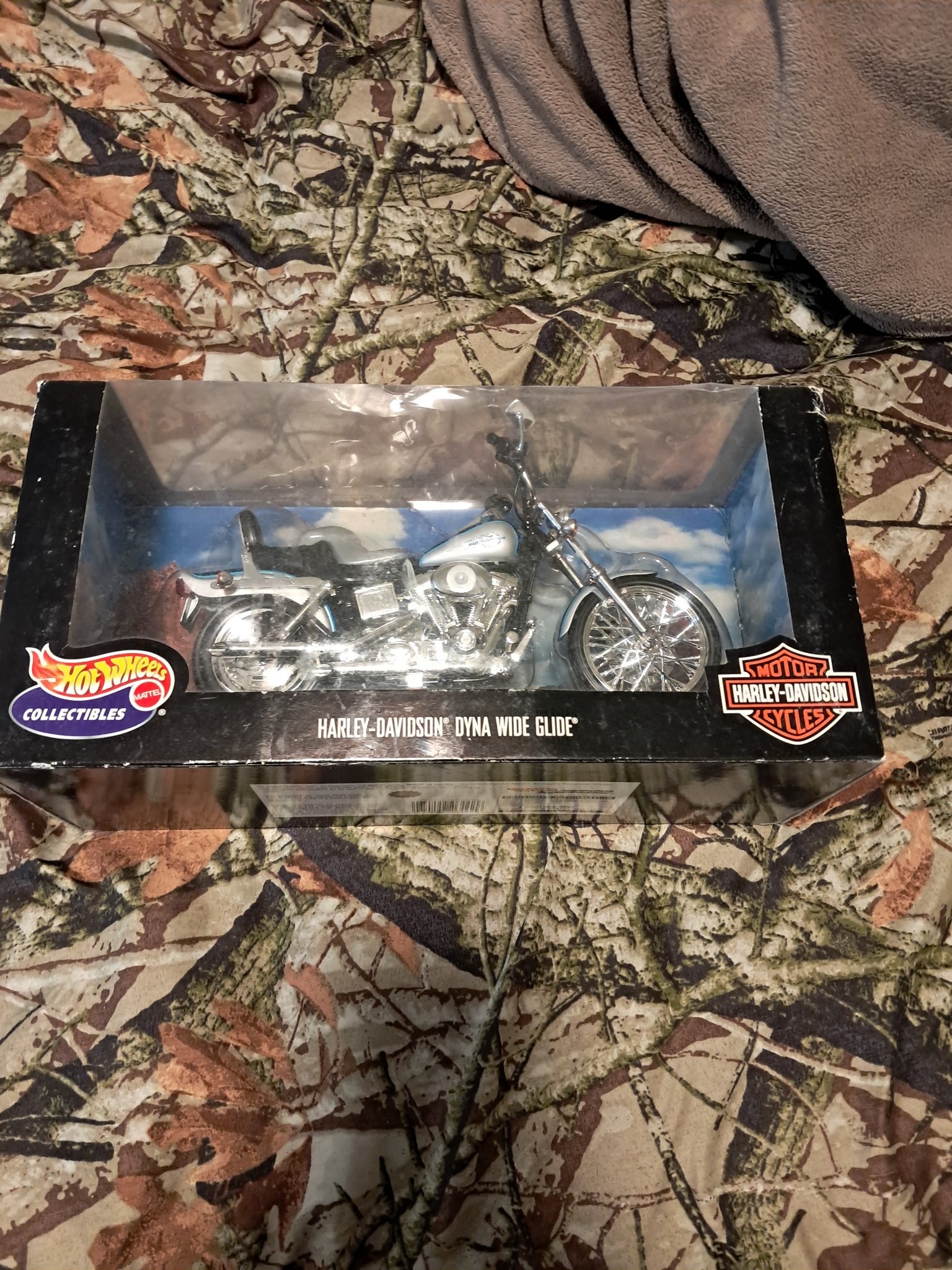 This item is a 1:18 scale die-cast model of a Harley-Davidson Dyna Wide Glide motorcycle, part of the Hot Wheels Collectibles series produced by Mattel. The model is presented in its original retail window-box packaging. The motorcycle features a two-tone light blue and silver paint scheme on the fuel tank and fenders. It is constructed with a high level of detail, incorporating a mixture of die-cast metal and chrome-plated plastic components. Notable features include realistic spoked wheels, a detailed V-Twin engine, long-profile exhaust pipes, and a small sissy bar on the rear seat. The packaging includes the official 'Hot Wheels Collectibles' logo on the left and the 'Motor Harley-Davidson Cycles' bar and shield logo on the right. Regarding condition, the model itself appears to be in mint, unused condition, protected by its original plastic casing. However, the outer cardboard box shows visible signs of shelf wear, specifically edge whitening, corner dings, and surface abrasions, particularly along the top and bottom black borders. The clear plastic window-front exhibits some light scratching and dimpling. This collectible dates likely from the late 1990s to early 2000s, targeting adult hobbyists rather than children, as evidenced by the high level of detail and 'Collectibles' branding.
