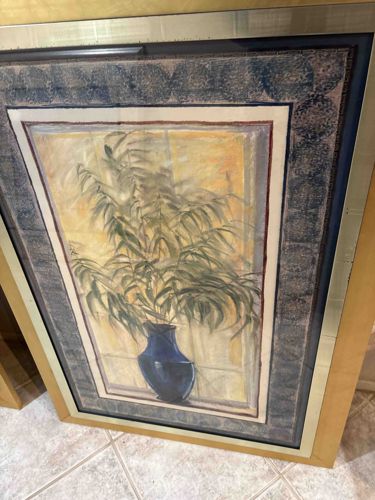 This is a large-format decorative botanical print housed in an ornate multisubstrate frame. The central artwork depicts a lush green plant, likely bamboo or similar foliage, arranged in a deep cobalt blue teardrop-shaped vase. The background of the print features warm yellow and gold tones with subtle painterly textures that suggest a window or an interior corner. The artwork is bordered by a wide, blue-toned decorative mat featuring a repeating circular or medallion-style pattern. The piece is finished with a sophisticated framing system consisting of a slim silver-toned inner fillet and a thick, high-gloss gold or light wood-toned outer frame. The overall style is consistent with late 20th-century or contemporary transitional interior design, likely dating from the 1990s to the early 2000s. The framing appears substantial with high-quality glazing. No major damage, such as glass cracks or significant frame chips, is immediately visible, though minor edge wear to the gilt finish is common for pieces of this vintage and scale. The craftsmanship suggests a high-end commercial decor piece designed for residential or professional office spaces.