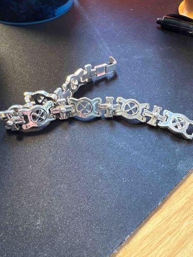 This item is a heavy, articulated link bracelet crafted in a bright silver-toned metal, characteristic of high-quality sterling silver. The design features a repetitive alternating pattern of two distinct link types: a 'CH Plus' stylized cross and an open-work circular ring containing an 'X' or crosshair motif. The construction is robust, utilizing integrated hinge pins to join the cast links, allowing for fluid movement. The finish is highly polished with darkened, oxidized recesses that provide contrast and highlight the intricate gothic-revivalist detailing. Measuring approximately 8 inches in length, the bracelet secures with a fold-over box clasp. The aesthetic is heavily influenced by the 'biker jewelry' style popularized by brands like Chrome Hearts in the late 20th century to present. Condition appears excellent with minimal surface abrasions and no visible signs of metal fatigue or repair. The craftsmanship is evident in the crisp casting of the symbols and the weightiness of the individual components, suggesting a premium fashion accessory or high-end designer piece.