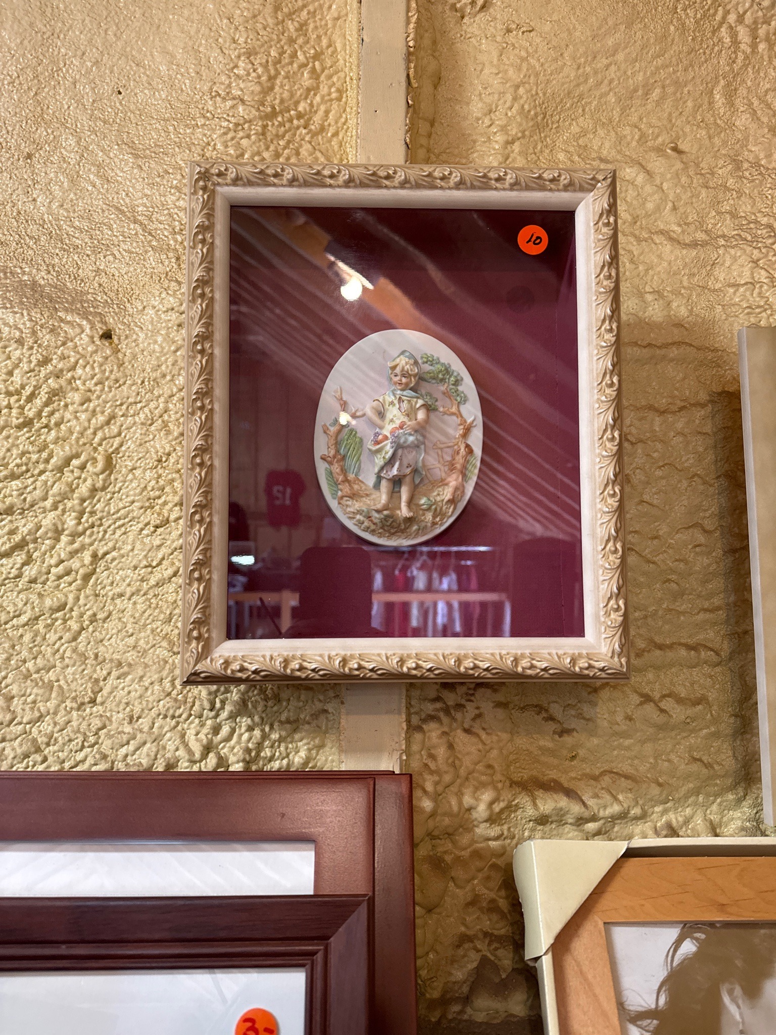 This item is a framed decorative art piece featuring a central oval bas-relief porcelain plaque, likely of German origin (suggestive of Heubach or similar porcelain houses) dating to the late 19th or early 20th century. The plaque depicts a young girl in a pastoral setting, dressed in rustic folk-style clothing with a blue kerchief, holding a gathered apron filled with fruit or vegetables. The relief is finely modeled with a matte bisque finish and colored in soft pastel polychrome glazes including greens, blues, and earth tones. The porcelain is mounted against a deep burgundy or maroon velvet-like fabric backing, which provides a high-contrast background. The assembly is housed within a rectangular shadowbox-style frame. The frame features an ornate scrolling acanthus leaf or shell motif around the perimeter, finished in a cream or off-white paint with intentional distressing or age-related patina revealing hints of an underlying gold leaf or wood tone. Noted condition includes a circular orange price sticker (marked '10') on the protective glass surface, which indicates its current retail environment. There are no immediate signs of cracks or chips to the porcelain visible through the glass, though some dust accumulation is present along the interior edges of the molding. The craftsmanship shown in the delicate features of the child and the textural details of the surrounding foliage points to a high-quality decorative object from the Victorian or Edwardian era.