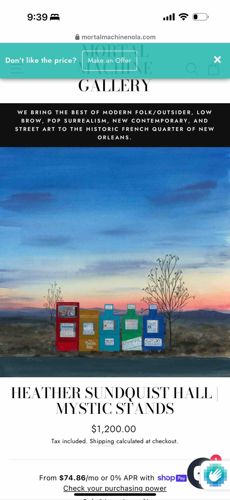 This original oil on canvas painting, titled "Mystic Stands," is a contemporary landscape work by artist Heather Sundquist Hall. Measuring 12x12 inches, the composition features a group of five brightly colored newspaper vending machines—red, yellow, turquoise, green, and blue—standing against a vast, atmospheric Texas-inspired horizon. The sky is rendered with a sophisticated gradient of deep blues transitioning into soft pinks and oranges at sunset, illustrating the artist's signature use of light and color to evoke nostalgia. The foreground shows a dark roadway strip, while the middle ground contains sparse, spindly dormant trees and low-lying scrub brush. The brushwork appears deliberate and smooth, characteristic of Hall's style which blends folk art sensibilities with modern contemporary aesthetics. Based on the digital representation, the artwork appears to be in excellent gallery condition with no visible signs of craquelure, paint loss, or surface abrasions. The craftsmanship is high-quality, demonstrating a refined control over color blending in the sky and precise geometric definition in the central subject matter. This piece represents the artist's focus on roadside Americana and the quiet beauty of the American West.