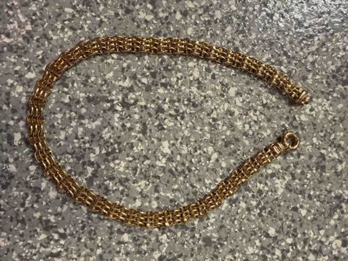 This item is a highly decorative yellow gold bracelet featuring a complex, triple-row woven or braided link construction. The design consists of interlocking circular and oval links that create a substantial, dimensional texture reminiscent of traditional Byzantine or panther-link styles. Its overall aesthetic suggests a late 20th-century vintage, likely from the 1970s or 1980s, an era when bold, chunky gold jewelry was highly fashionable. The bracelet's high-shine finish and rich yellow color indicate either high-karat gold (such as 14k or 18k) or a high-quality heavy gold plating over a base metal. The bracelet is finished with a traditional spring-ring clasp attached to a decorative end-cap, which appears to be in functional condition. Although no maker's marks or hallmarks are clearly visible in the image, the uniformity of the weave suggests a high level of machine-assisted craftsmanship. Regarding its condition, the piece shows a gentle patina with minor surface scratches consistent with careful previous wear. No significant kinking, broken links, or major repair work is evident from the provided view. The weight and flexibility of the weave are indicators of its quality, as the three parallel strands remain aligned while maintaining enough fluidity to drape comfortably around the wrist.