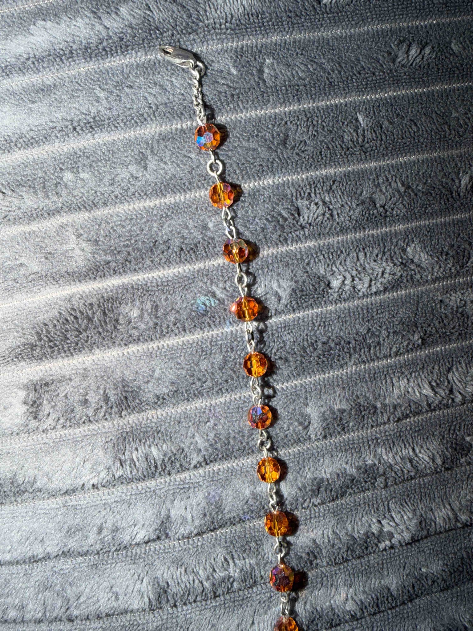 This fine jewelry piece is a link bracelet featuring a series of multifaceted round beads, likely Swarovski-style crystals or glass, in a warm amber or topaz orange hue. The beads possess an 'Aurora Borealis' (AB) coating, which creates a shimmering iridescent effect that reflects blue and purple light at certain angles. Each bead is individually wire-wrapped or linked using silver-toned metal pins, connecting to a classic silver-toned cable chain. The construction suggests a late 20th-century or contemporary fashion jewelry design. The item utilizes a secure lobster claw clasp mechanism. Physically, the bracelet's metal components show minor surface oxidation or tarnishing consistent with age and silver-plating. The crystals appear largely intact without major chipping, though some micro-abrasions from wear may be present on the facet edges. There are no visible hallmark stamps or '925' marks discernible in the image, suggesting the base metal may be a nickel-free alloy or silver-plated brass. The craftsmanship is consistent with high-quality boutique costume jewelry, focusing on repetitive geometric symmetry and light refraction.