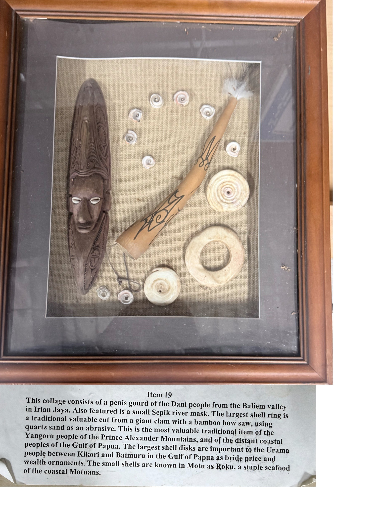 This shadow box display, identified as Item 19, contains a curated collage of traditional cultural artifacts from Papua New Guinea and Irian Jaya. The centerpiece elements include a 'Koteka' or penis gourd associated with the Dani people of the Baliem Valley, featuring a slender, curved, tan-colored organic form with dark decorative linear etchings and white feathers at the tip. Beside it sits a dark wood Sepik River mask, characterized by elongated proportions, almond-shaped cowrie shell eyes, and intricate tribal carvings on the forehead and chin. The assembly also features various shell currencies and ornaments: a large ring carved from a giant clam shell using traditional quartz sand abrasives, attributed to the Yangoru people; several large flat shell disks used as bride price by the Urama people; and numerous small operculum shells known as 'Roku' by the Motuans. The items are mounted on a tan burlap backing within a deep-set wooden frame with a glass front. The condition appears fair, though there is visible dust and debris accumulated at the bottom of the frame behind the glass, which is common for older shadow box mounts. The artifacts show signs of authentic traditional manufacture, such as the matte finish of the hand-carved wood and the natural irregularities in the ground-down clam shells, suggesting they are mid-to-late 20th-century ethnographic pieces.