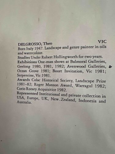This item is an original artist biography label or gallery documentation associated with an oil painting by Theo Delgrosso. The document is printed on a light-colored, off-white paper or cardstock which shows minor age-related toning and subtle surface foxing/spotting. The typography is a clean, san-serif or transitional serif font consistent with early 1980s gallery ephemera. It details the artist's background: born in Italy in 1947, and later working in Victoria (VIC), Australia. Delgrosso is described as a landscape and genre painter working in oils and watercolor. The text lists his training under Robert Hollingworth and highlights significant exhibition history from 1980 to 1982 at Australian venues like Balmoral Galleries and Avenwood Galleries. It further notes award achievements including the Colac Historical Society Landscape Prize and the Roger Manson Award. This provenance documentation is a critical quality indicator for the associated artwork, confirming the artist's professional standing and presence in international collections. The condition appears stable with no major tears, though the edges are outside the frame of the image.